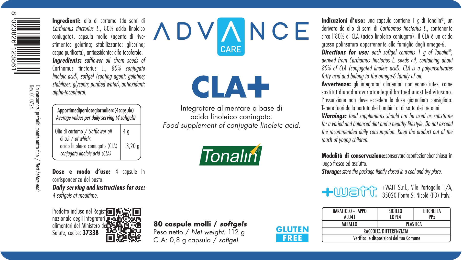Il prodotto CLA+ contiene principalmente Acido Linoleico Coniugato (CLA), derivato dall'olio di cartamo, e Vitamina E, un antiossidante naturale che protegge le cellule dallo stress ossidativo.
